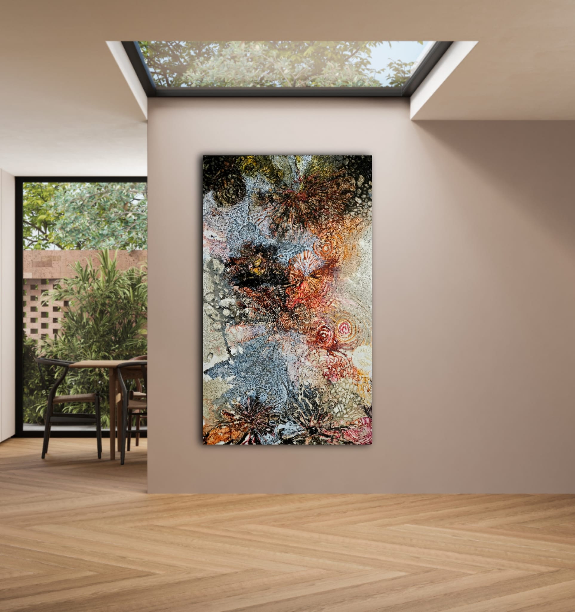The artwork is unframed and has a professionally stretched canvas on wooden braced framework. Edges of the artwork are painted to continue the artwork from the sides.